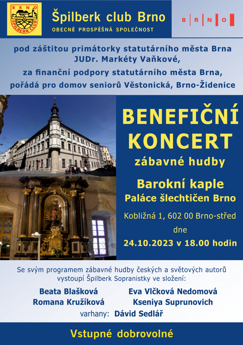 Dne 24.10.2023 se v 18.00 hodin v Barokní kapli Paláce šlechtičen, Kobližná 1, uskuteční koncert zábavné hudby ve prospěch domova seniorů Věstonická, Brno-Židenice.