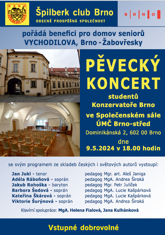 Dne 9.5.2024 v 18.00 hod. se uskuteční ve společenském sále ÚMČ Brno-střed, Dominikánská 2, pěvecký koncert studentů konzervatoře Brno.